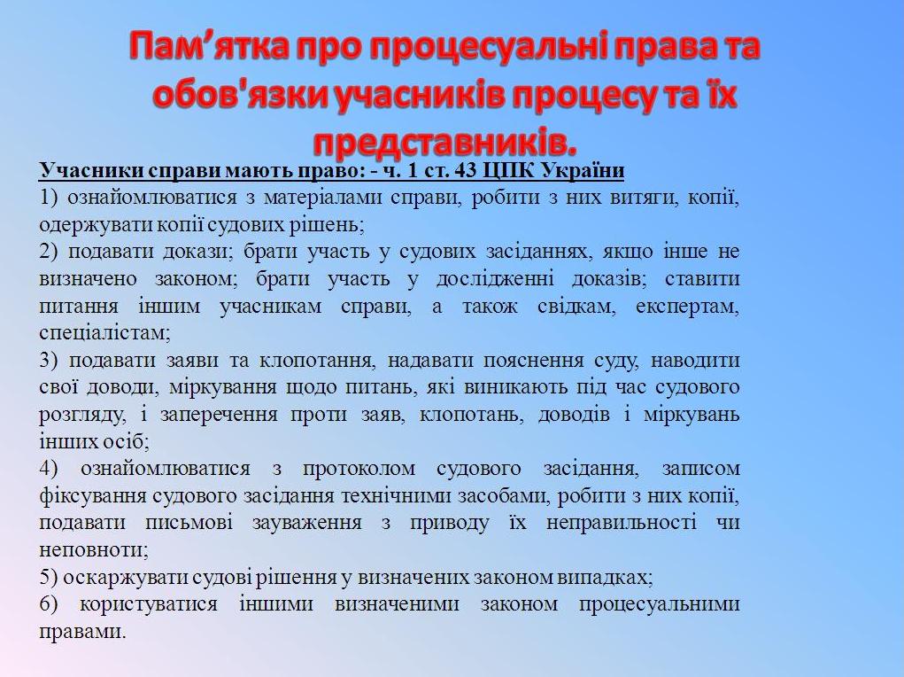 Придніпровський районний суд м. Черкас оприлюднив інформацію про процесуальні права та обов'язки учасників справи, та їх представників